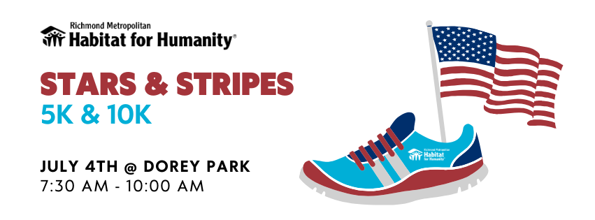 Richmond Habitat is the beneficiary of the Stars and Stripes 5k &10k in Dorey Park this Fourth of July. Volunteers will be assisting at the Habitat table and handing out medals and refreshments at the finish line. Please check in with Daniel Milburn or Jenn O'Rourke at the Habitat table where you will be given instructions and a Habitat button to wear.